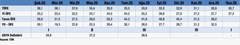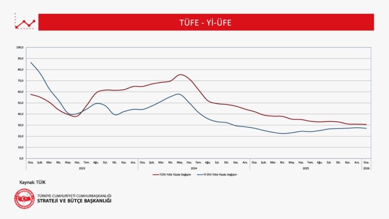 Şimdi gelelim 2026 Ocak tüketici fiyatları endeksi (TÜFE), üretici fiyaları endeksi (ÜFE) ve çekirdek enflasyon verilerine… Türkiye Cumhuriyet Merkez Bankası (TCMB), ‘Ocak Ayı Fiyat Gelişmeleri Raporu’nu yayımladı. Rapora göre, TÜFE ocak ayında yüzde 4.84 arttı, yıllık enflasyon 0.24 puan düşüşle yüzde 30.65 seviyesinde gerçekleşti. Bu TÜİK’in rakamları, peki ya ENAG’in ocak ayı enflasyon oranı ne? Yüzde 6.92… Yılbaşından bu yana, market raflarındaki etiketleri takip ettiyseniz, gıda enflasyonun TÜİK’in açıkladığı rakamlardan uzak ara yüksek olduğunun da farkındasınızdır!