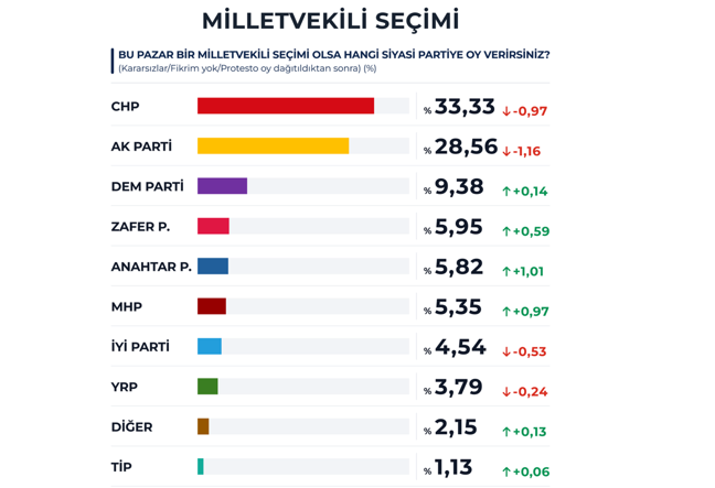 Anket sonuçlarına göre; kararsızlar, fikrim yok ve protesto oyların oransal olarak dağıtılmasının ardından CHP yüzde 33,33 ile birinci parti konumunu koruyor. AKP yüzde 28,56 ile ikinci sırada yer alırken; DEM Parti yüzde 9,38, Zafer Partisi yüzde 5,95, Anahtar Parti yüzde 5,82, MHP yüzde 5,35, İYİ Parti yüzde 4,54, Yeniden Refah Partisi yüzde 3,79, diğer partiler yüzde 2,15 ve TİP yüzde 1,13 oranında destek alıyor.