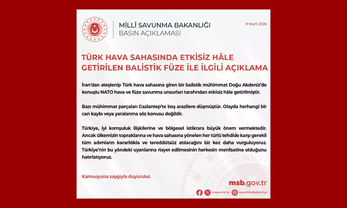 Bakanlık, 9 Mart 2026 tarihli açıklamada, Türk hava sahasının ihlal edildiğini ve NATO hava savunma unsurlarının müdahale ettiğini duyurdu. Parçaların düştüğü bölgelerde güvenlik birimleri inceleme başlattı.