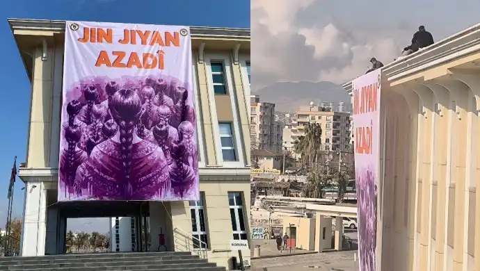 Cizîr (Cizre) Belediyesi hizmet binasına sabah saatlerinde saçları örgülü kadınların yer aldığı “Jin, jiyan, azadî” pankartının asılması ile ilgili gözaltına alınan 4 belediye personeli serbest bırakıldı. Pankartın asılmasından sonra belediye binasını ablukaya alana polisler, herhangi bir resmi tebligat olmaksızın zorla hizmet binasına girerek, pankartı sökmüştü. “Savcının sözlü talimatı var” diyen polisler, belediye personeli Hasan Candoruk’u gözaltına alarak, ilçe emniyet müdürlüğüne götürdü. Devamında belediye personelleri Abdülaziz Avşar, Süleyman Ebret ve İbrahim Tonçer’i de ifadeye çağıran polisler, 3 kişi hakkında da gözaltı işlemi uyguladı.