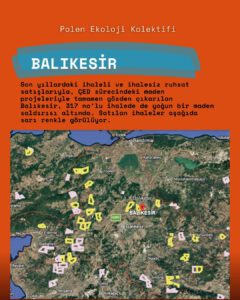 BALIKESİR: Son yıllardaki ihaleli ve ihalesiz ruhsat satışlarıyla, ÇED sürecindeki maden projeleriyle tamamen gözden çıkarılan Balıkesir, 317 no’lu ihalede de yoğun bir maden saldırısı altında. Balıkesir’de tek bir toplu ihalede toplamı 38.322 hektara ulaşan (53.672 futbol sahası genişliğinde) 29 ruhsat sahası madenci şirketlere satıldı.